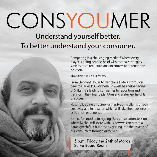 Sarva Integrated concluded another successful ‘Inspiration Session’ for clients, friends and members of the marcom community, featuring revered Brand Consultant, Michel Nugawela. Titled “Consyoumer”, the session, which was held on the 24th of March, revolved around the importance of understanding the psyche of consumers, by better understanding ourselves. Sarva ‘Inspiration Sessions’ have become a regular…